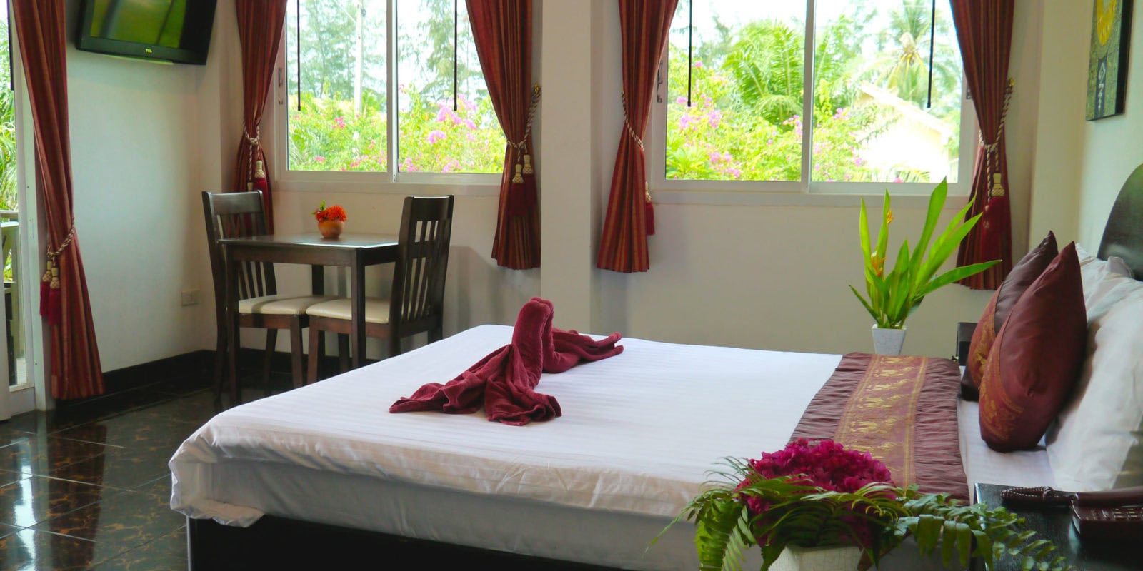 …mit Wohlfühlgarantie für Gäste aus aller Welt. Denn die Ausstattung unserer Hotelzimmer und Bungalows entspricht dem weltweit anerkannten 4-Sterne-Standard: Queen-Size-Bett, Kühlschrank inklusive Freigetränken, Sitzecke, Lan-Anschluß in jedem Zimmer und W-Lan im gesamten Resort, TV mit Flachbildschirm von min. 32 Zoll, geräumige Badezimmer, Balkon oder Terrasse mit Sitz- und Liegemöbeln.